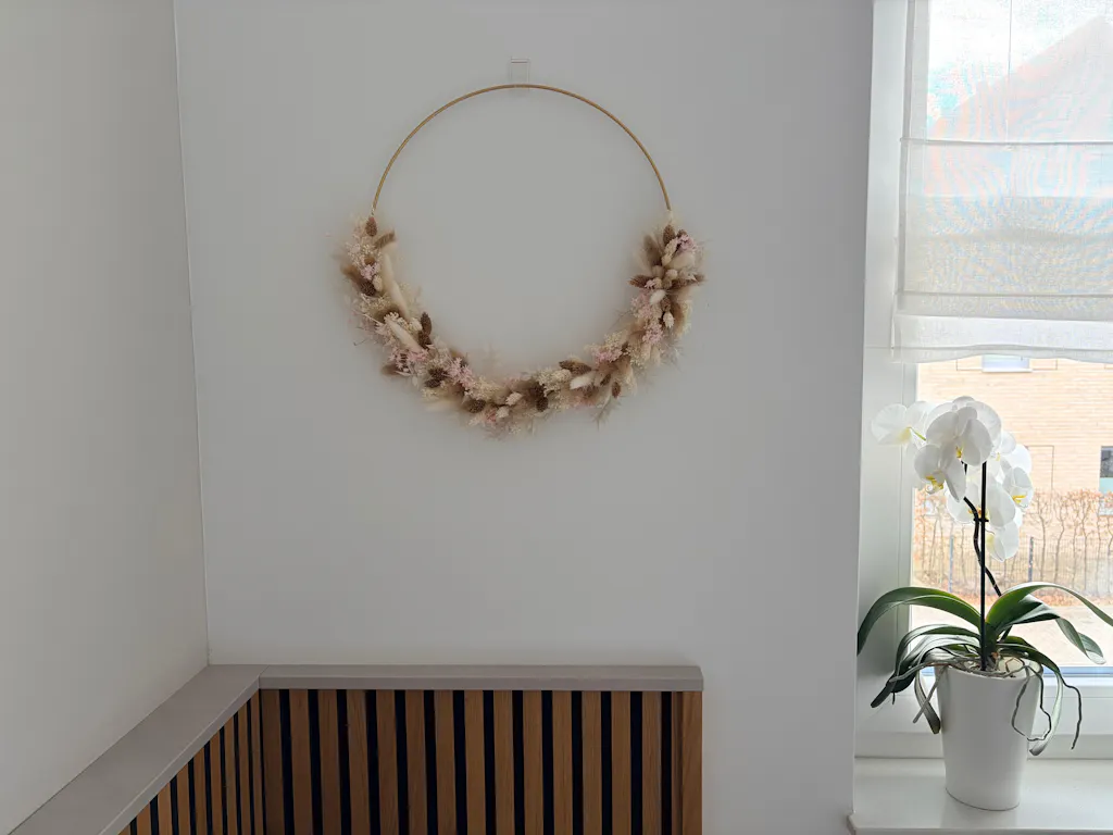 Ich habe nun schon zum dritten Mal bei Lykke & You bestellt und bin wie immer total begeistert!! Ich habe den Trockenblumenkranz mit einem Durchmesser von 40cm gekauft. Der Kranz wurde sehr vorsichtig und sicher verpackt und der Versand erfolgte super schnell. Ich konnte den Kranz ohne groΓe MΓΌhe und Vorbereitung an der Wand anbringen und er sieht einfach traumhaft schΓΆn in unserem Schlafzimmer aus!