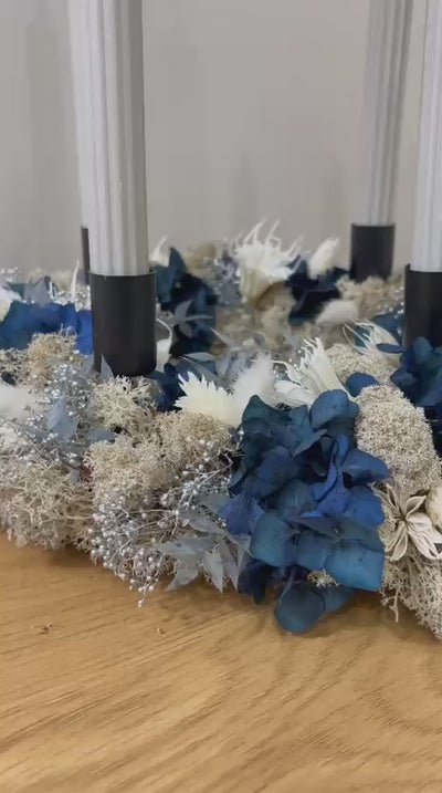 Der Adventskranz „Nordlicht“ ist eine Hommage an die stille Schönheit nordischer Winter. In kühlen Weiß- und Blautönen gehalten, wirkt er wie von Raureif überzogen – reduziert, elegant und außergewöhnlich.