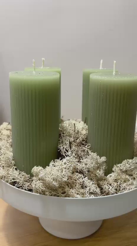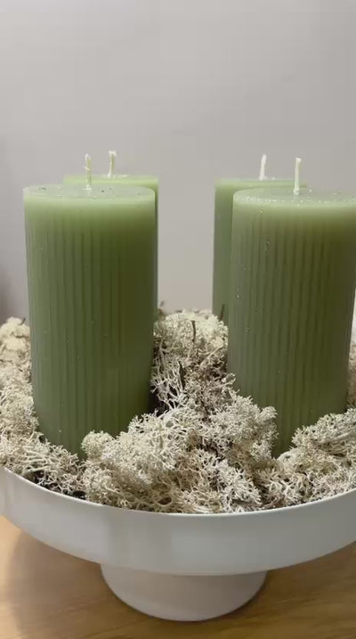 Das elegante weiße Tablett auf Fuß bildet die perfekte Bühne für vier sanft hellgrüne, gerillte Blockkerzen, die an klare Nordlichter erinnern. Ergänzt wird das Arrangement durch zartes, hellgraues Rentiermoos, das dem Set eine natürliche, ruhige und zugleich moderne Ausstrahlung verleiht.