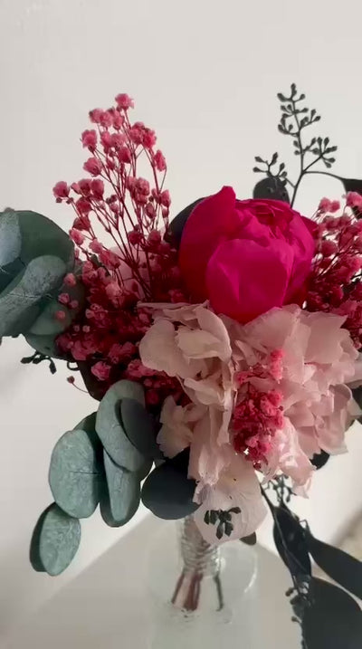 Lieblingsmensch ist ein kleiner Trockenblumenstrauß mit großer Bedeutung. Eukalyptus bildet die ruhige Basis, ergänzt durch Pfingstrose, Rose und Hortensie in sanften Rosé- und Pinktönen. Natürlich, harmonisch und liebevoll gestaltet.