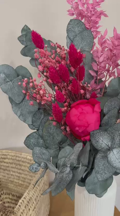 Pinkes Herz: Trockenblumenstrauß mit Pfingstrose, Eukalyptus in grün-pink