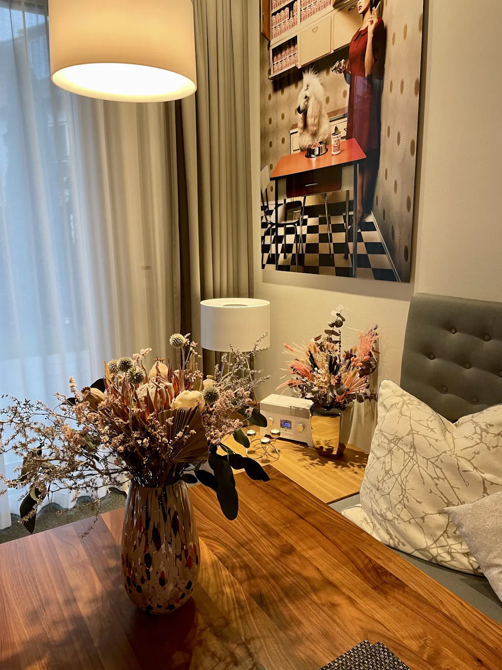As a special highlight, we added pink pampas grass to the dried flower bouquet. Gypsophila, ruscus and poppy seed capsules complete the look.
