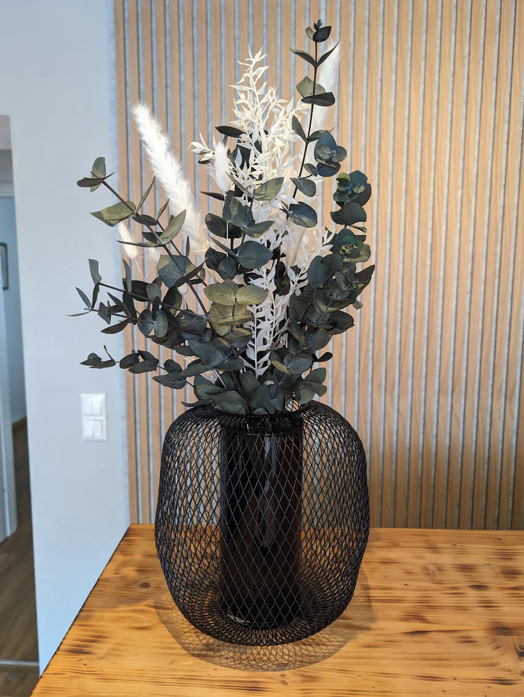 - Eucalyptus cinerea green, pampas grass, ruscus, lagurus