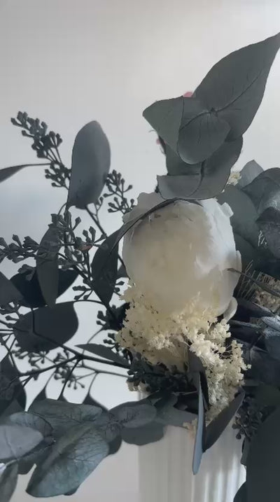 Materialien: Konservierte Englische Rosen, Stielrosen Kiara, Pfingstrosen, Eukalyptus Cineria & Populus mit Beeren